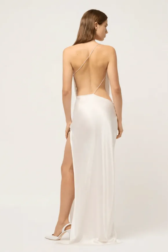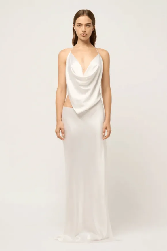 Introducing the Michael Lo Sordo Iced Bias Maxi Dress in White. Pose in the draped Iced Bias Dress with a handkerchief-style blouse joining a full-length skirt with a side split. Playful asymmetrical spaghetti straps cross over to reveal an open back, and the liquid silk-satin gracefully cascades from the hips, creating a dramatic silhouette reminiscent of the Venus de Milo.