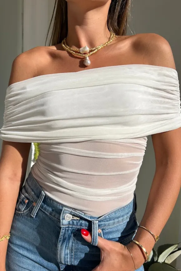 Introducing the Benni Nico Off-Shoulder Top in White, a chic summer update of the beloved Yasmin top. Featuring an off-shoulder design and breathable sheer mesh fabric, this top combines style and comfort effortlessly. The internal jersey shelf offers full coverage for confident wear, making it a versatile choice for any occasion.