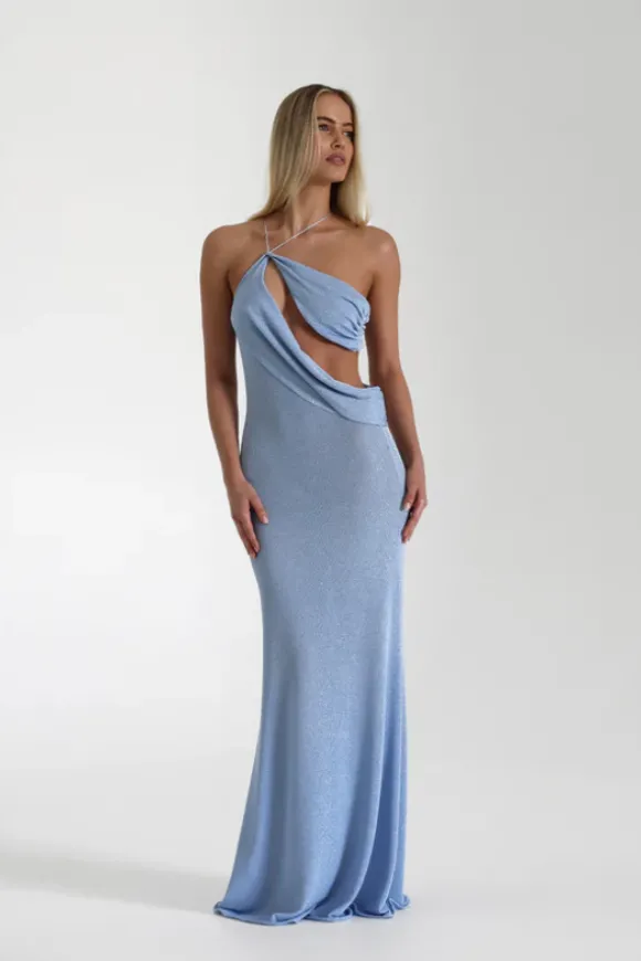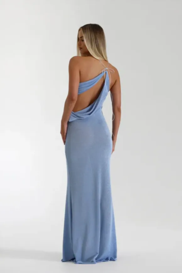 The Elissa Dress features a gracefully draped silhouette that effortlessly flatters the feminine form. Its asymmetrical cutaway detail adds a daring touch, balanced by a full-length skirt for timeless elegance. Crafted from a luxurious stretch-knit fabric with interwoven metallic threads, it shimmers beautifully with every movement. Adjustable cords ensure a custom fit, making the Elissa Dress perfect for sophisticated evening events or special occasions.
