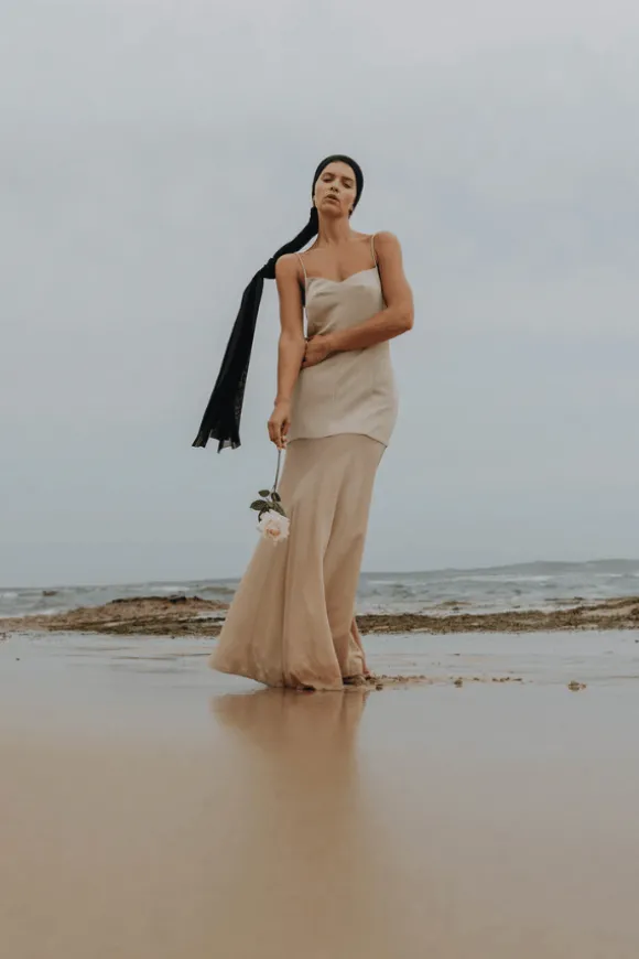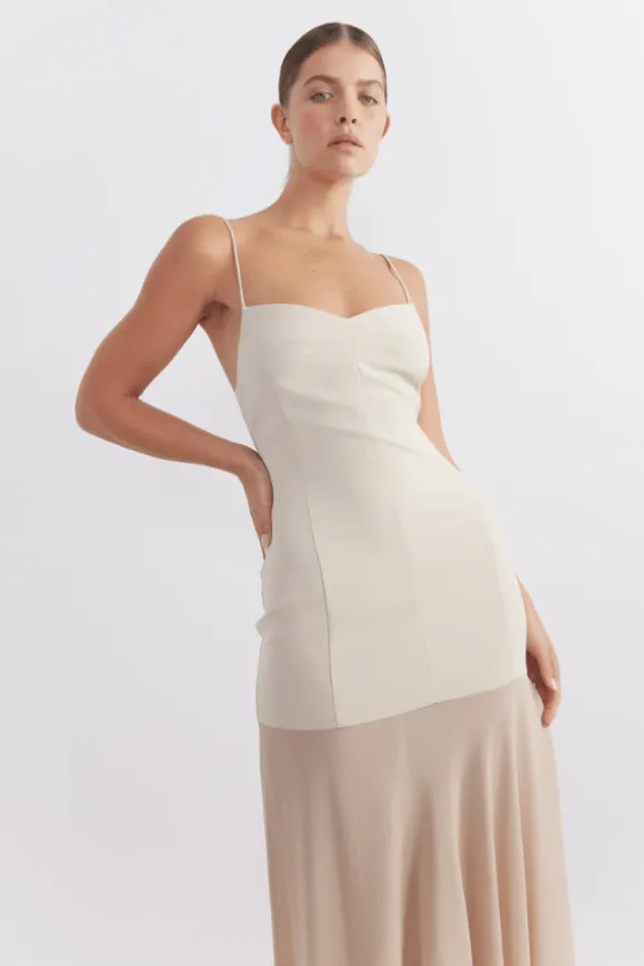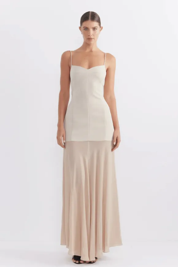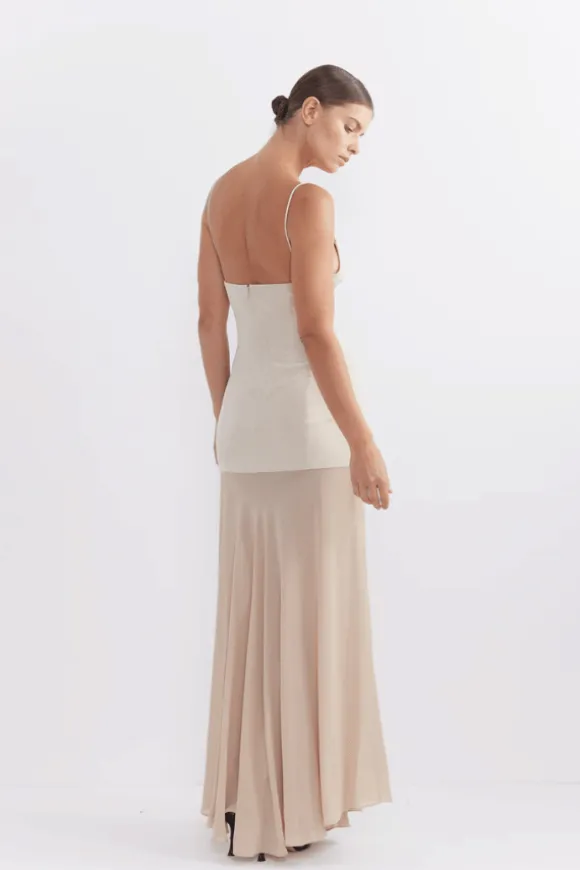 Introducing the Pasduchas Harriette Maxi Dress in Stone combines soft stretch twill suiting with a contrasting heavy viscose chiffon skirt for a sophisticated look. Featuring delicate straps and a subtle sweetheart neckline, this dress is fitted through the body with linear panel detailing before cascading into a sheer maxi-length skirt.