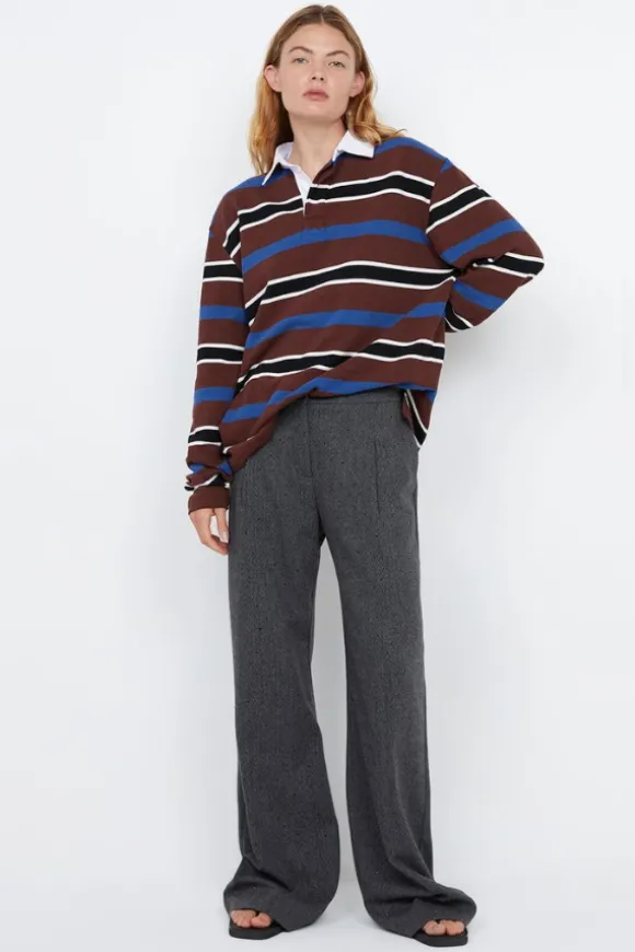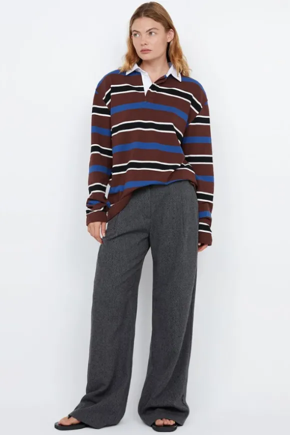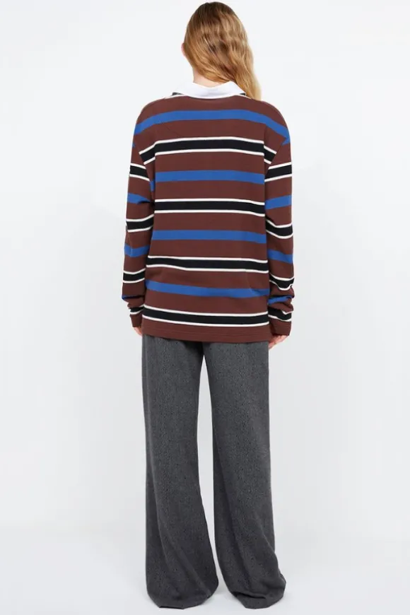 The Kylo Jersey in Plum and Indigo Stripe offers a relaxed, stylish look with its soft cotton jersey fabric. Featuring chocolate plum and indigo blue stripes, it’s paired with a white contrast collar for a fresh touch. The relaxed fit with dropped shoulder seams ensures comfort, while the turned-up hems finished with twin needling add subtle detailing. Designed for easy wear with pull-on styling, this jersey is perfect for casual days. Styled with Bec + Bridge Shae Oversized Pant.