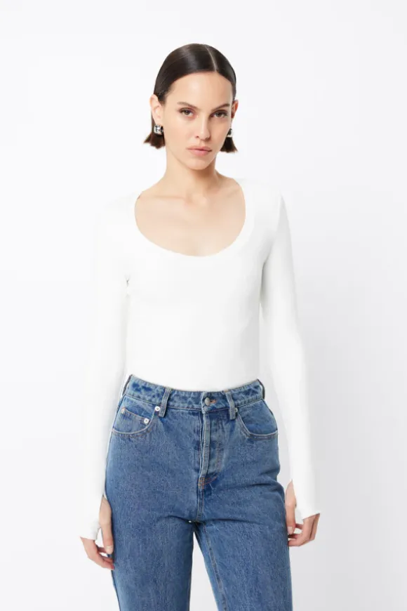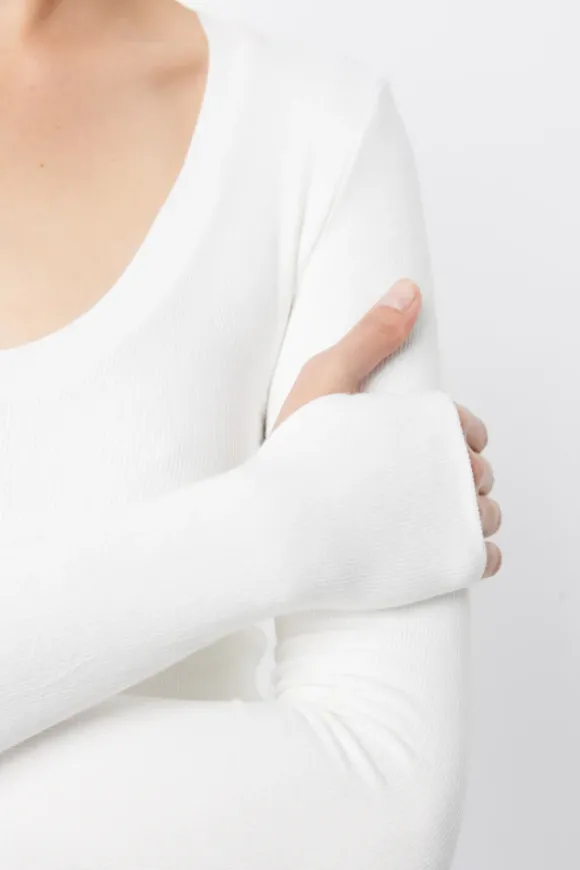 The Lincoln Top in White is a timeless essential for your capsule wardrobe. Crafted from a soft, double-layered ribbed jersey, this top offers both comfort and stretch, keeping you warm during the cooler months. Featuring a flattering scoop neckline, long sleeves, and thumb-hole detailing, this piece is designed for effortless trans-seasonal styling. Its sleek, form-fitting silhouette pairs seamlessly with wardrobe essentials for a polished, elevated look.