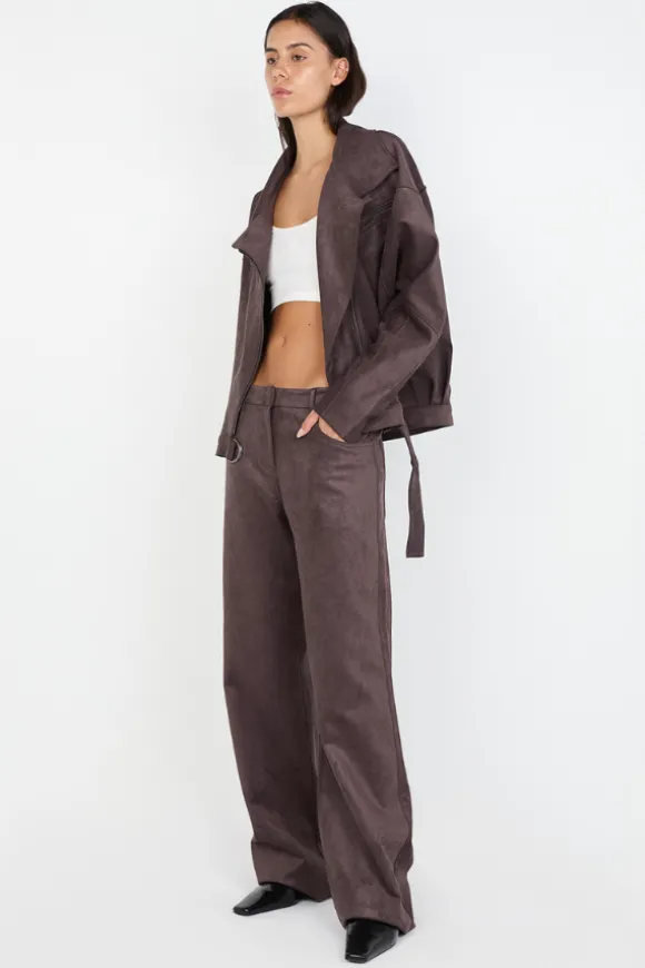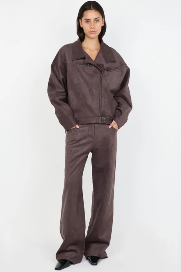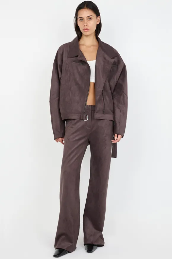 The Lyon Bomber in Chocolate is a statement-making outerwear piece, crafted from soft faux suede for a luxe feel. Designed with an oversized silhouette and batwing sleeves, this bomber jacket exudes effortless edge. Panelling throughout the garment enhances its structured yet relaxed fit, while the asymmetrical center-front zip and self-belt with metal ring hardware add bold detailing. Finished with external metal zippers, inseam pockets, and a fully lined interior, the Lyon Bomber is the perfect blend of style and function.