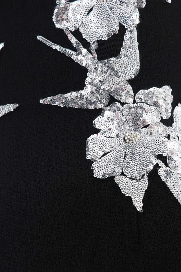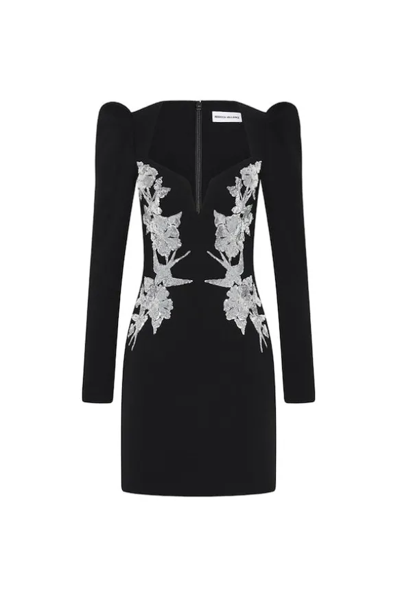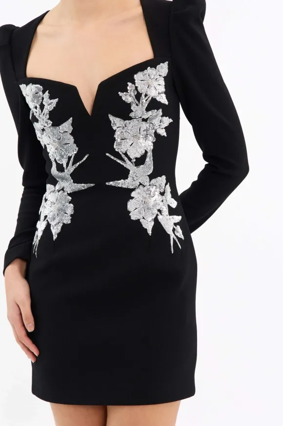 The Monroe Long Sleeve Mini Dress in black is a chic choice, featuring a striking silver sequin applique design. The fitted long sleeves with padded shoulders and stunning V-wire neckline create a flattering silhouette, enhanced by princess seams. Fully lined, a silver exposed zip fastening at the back offers practicality and comfort. Perfect for special events or date nights, this dress is undeniably charming.