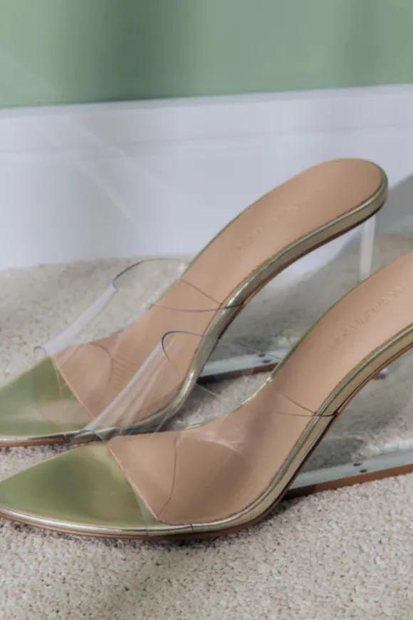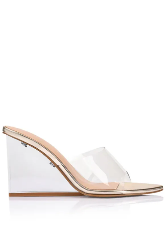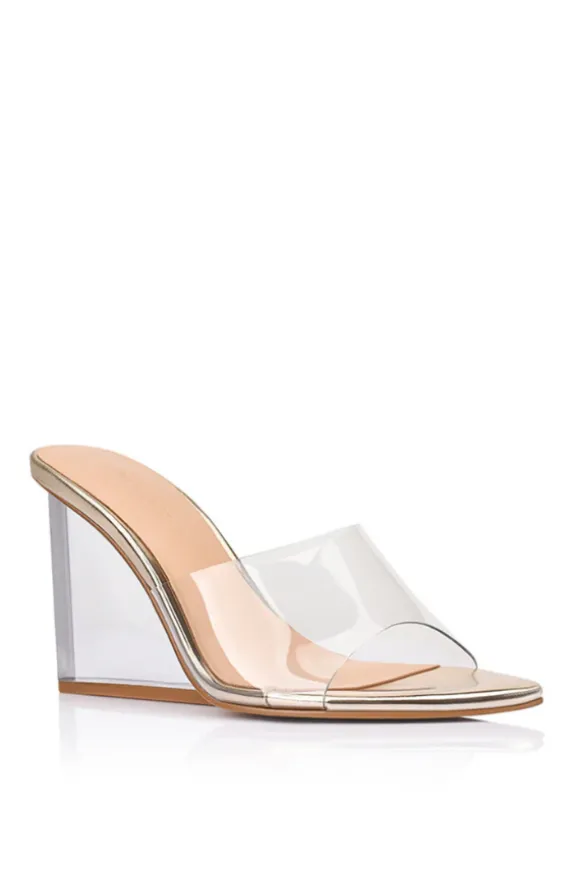 Introducing the Lana Wilkinson Suzy in Gold,a chic sandal designed to elevate your look without stealing the spotlight. With a lucite wedge heel and a leg-enhancing vinyl upper, this barely-there sandal perfectly complements any outfit.