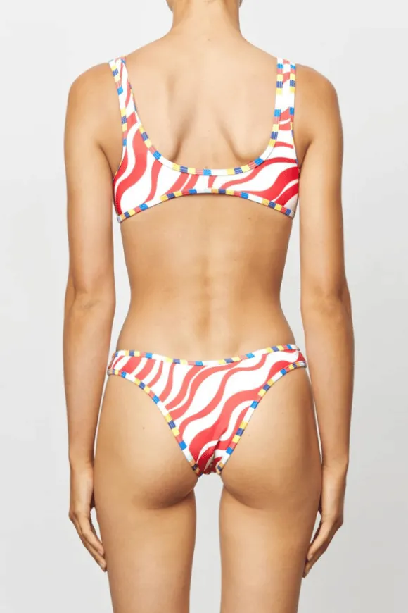 Introducing “The 90’s Duo Crop Top Campino” from the It’s Now Cool collection. This modern crop features a scoop neck front and low back design. The design is engineered to provide a supportive and flattering fit with uplifting underband and contrast bound multi-colour edge detail. This fully lined crop is feminine and sporty all in one, making it a perfect layering piece. Featuring our Red and White wavey print.