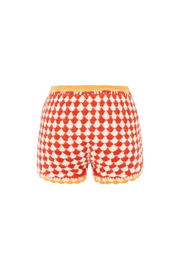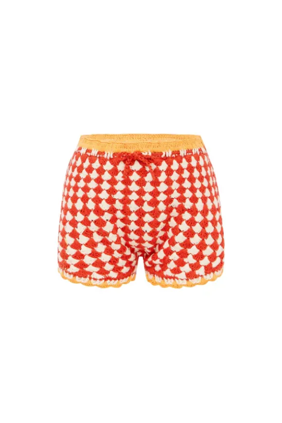 A perfect fusion of style and comfort, the Crochet Shortie in Conmigo is a must-have for summer. Featuring a bold red and white check crochet design, accented with soft orange scallop edging, these hand-crafted shorts offer full coverage while maintaining a breezy, beach-ready feel. Fully lined for extra comfort, they are an effortlessly versatile piece that can be worn on or off the sand.