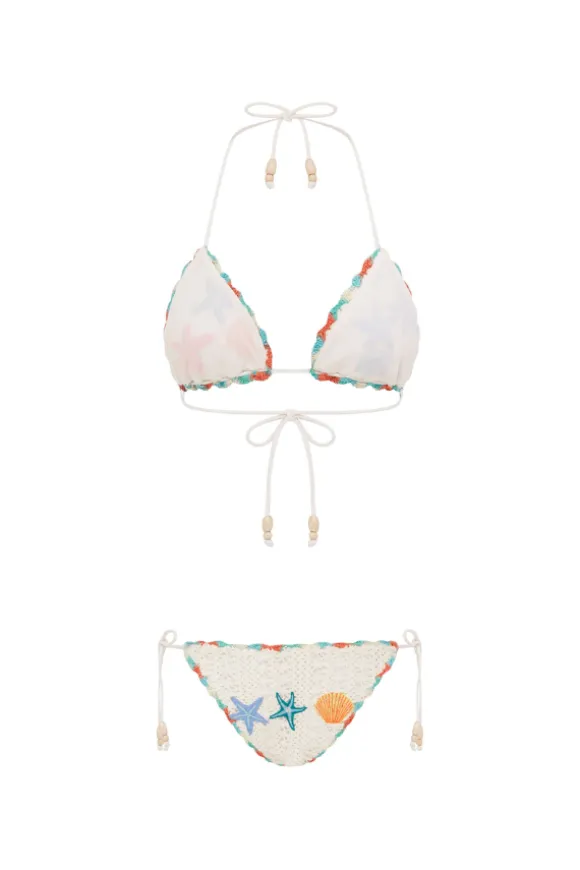 The Crochet Tie Pant in Fuji features white crochet adorned with standout ocean-themed motifs. It is accented with multi-coloured contrast edging and wooden beads on the ties, giving it a unique and stylish touch. Perfect for pairing with the matching top for a coordinated beach look.