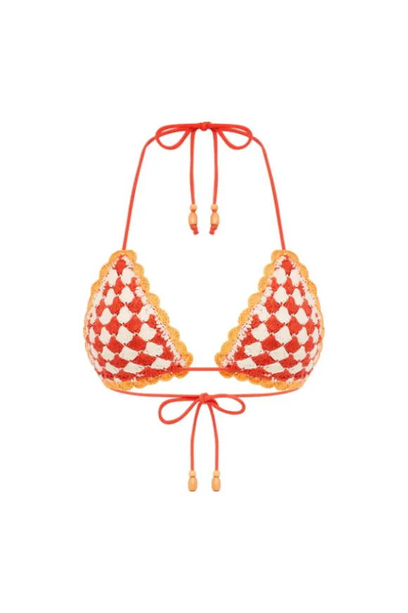 Designed for sun-drenched days, the Crochet Tri in Conmigo is a hand-crafted statement piece featuring a striking red and white check crochet pattern, complemented by delicate orange scallop edging. The halter neck silhouette is adorned with wooden bead detailing along the straps, adding a touch of bohemian charm.