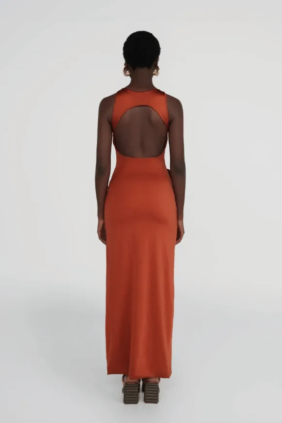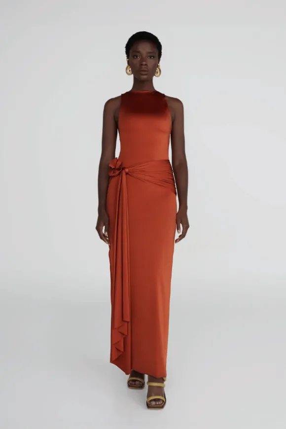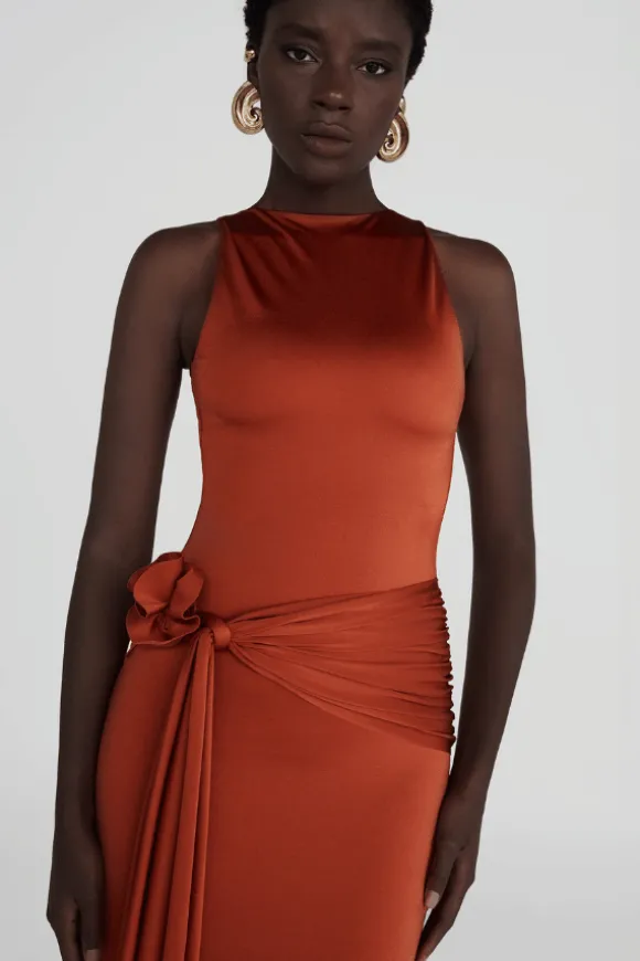 Introducing the Maygel Coronel Tirso dress in Spring Green. This long dress features a round neckline at the front and a seductive open back for a striking silhouette. It contours the body in all the right places and includes a ruched adjustable sash at the waist for added elegance. Enhanced with a 3D handmade flower detail, the Tirso dress exudes an alluring and powerful style.