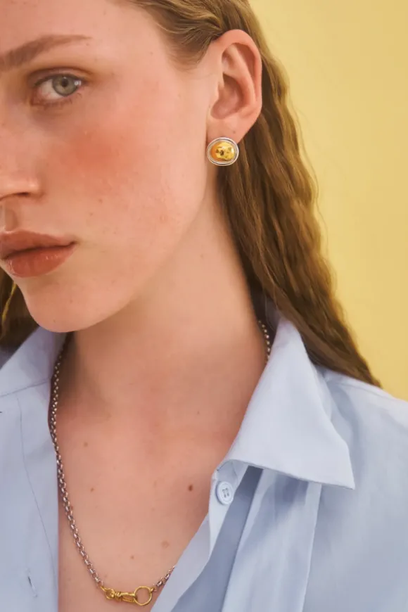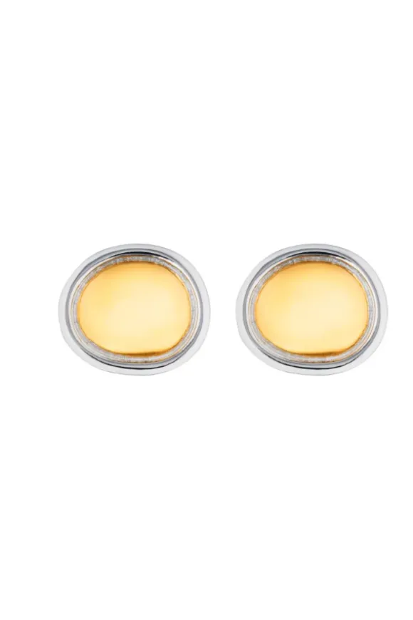 The Uovo Stud Earrings are a refined statement piece, with a smooth, golden egg-shaped center framed by a polished silver outline. Compact and gracefully curved, these earrings bring an effortless touch of elegance to everyday wear.